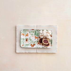 This stoneware platter with a woodland pattern is a delightful way to bring some nature-inspired charm to the table. The platter showcases a lovely design of flowers, leaves, birds, and animals in bright and cheerful colors. The platter is made of high-quality stoneware that is sturdy and microwave-safe, making it ideal for everyday use or special occasions. Whether for serving favorite dishes or displaying it as a decorative accent, this platter will add some warmth and personality to the home. A charming stoneware platter that features a whimsical woodland flora and fauna pattern in vibrant colors. A perfect addition to any rustic, farmhouse, or cottage style kitchen or dining room. A versatile platter that can be used for serving appetizers, snacks, desserts, or as a decorative centerpiece.