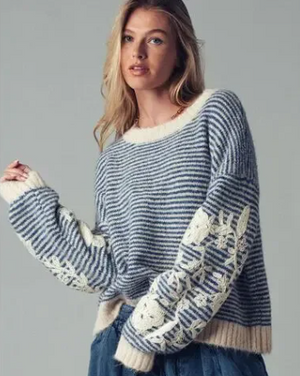 This adorable striped knit sweater combines classic blue and white stripes with charming floral embroidery for a look that's both timeless and fun. Soft, cozy, and endlessly versatile, it's the kind of piece that works whether you're dressing up a casual weekend or layering for extra warmth.