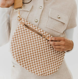 Meet the Westlyn Woven Bum Bag in checkered tan gorgeous woven vegan leather. Beautiful hardware with a zipper closure with beige and black chevron interior, and a zippered slash pocket on the inside. This crossbody bag is the perfect accessory to elevate any outfit! Measurements: 12"L x 8"H x 24"-46" strap Material: Vegan Leather