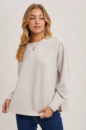 The oversized knit sweatshirt combines comfort and contemporary style. Designed with a relaxed, roomy fit, this sweatshirt features subtle side slits that add both breathability and a trendy touch to the overall look. Its soft knit fabric ensures warmth and coziness, making it perfect for casual, everyday wear.