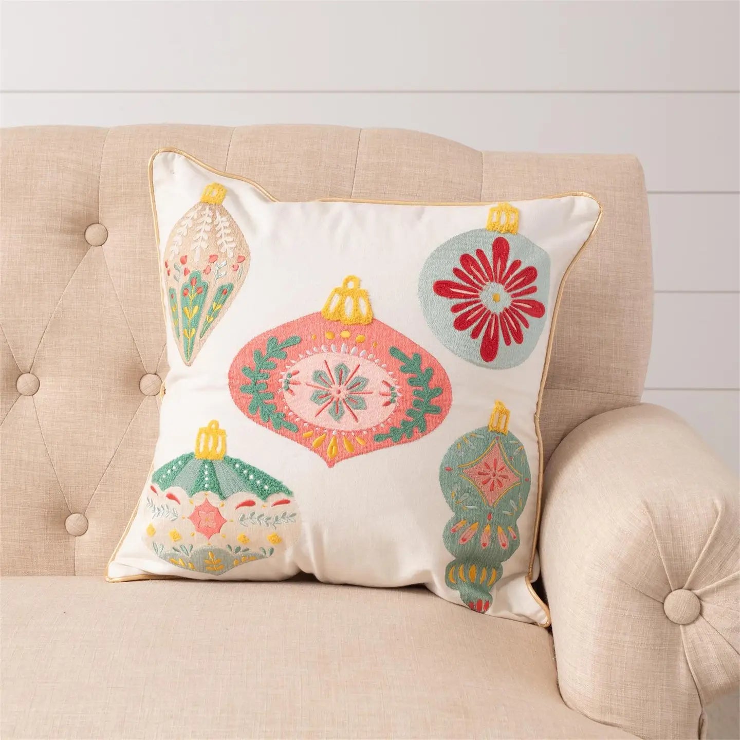 This embroidered Merry Ornaments pillow brings nostalgic charm to holiday displays with a fresh pastel palette. Featuring richly stitched vintage-style ornaments on a crisp ivory cotton base, it offers standout shelf appeal and gifting potential. Gold piping adds a festive finish. Perfect for cozy corners or front-of-store holiday styling. Cotton 18" H x 18" W.