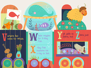 All aboard the Alphatrain! This adorable two-in-one board book features beautifully illustrated animals for every letter of the alphabet and can be read page-by-page as a lap book or be unfolded into a 56" train! (Perfect for play time or room decor!) In addition to the animals, each whimsically designed train car includes fun objects for each letter: Bear eats a banana, Elephant listens to earphones, and Fox wears a fez (of course). As a bonus, the back of each page lists the words of each hidden object so kids can search for them on the front of the car. A handy clasp keeps everything snuggly shut when reading time is over.