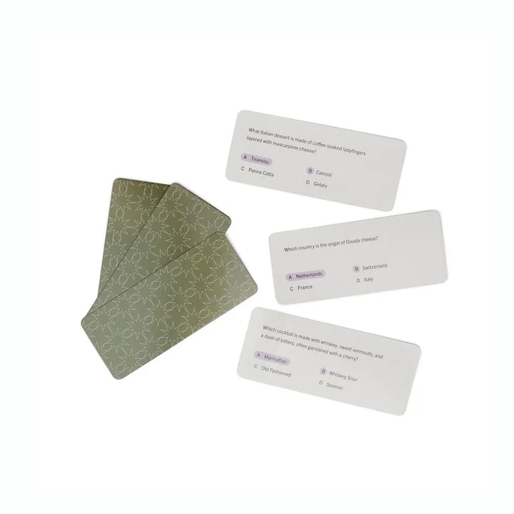 Packed with fun facts, boozy brain teasers, and tasty tidbits, this trivia set is your recipe for a good time, shaken, not stirred.