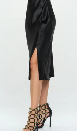 Slip into effortless elegance with this satin midi skirt that glides from day to night. A chic side slit adds a flirty touch of sophistication.